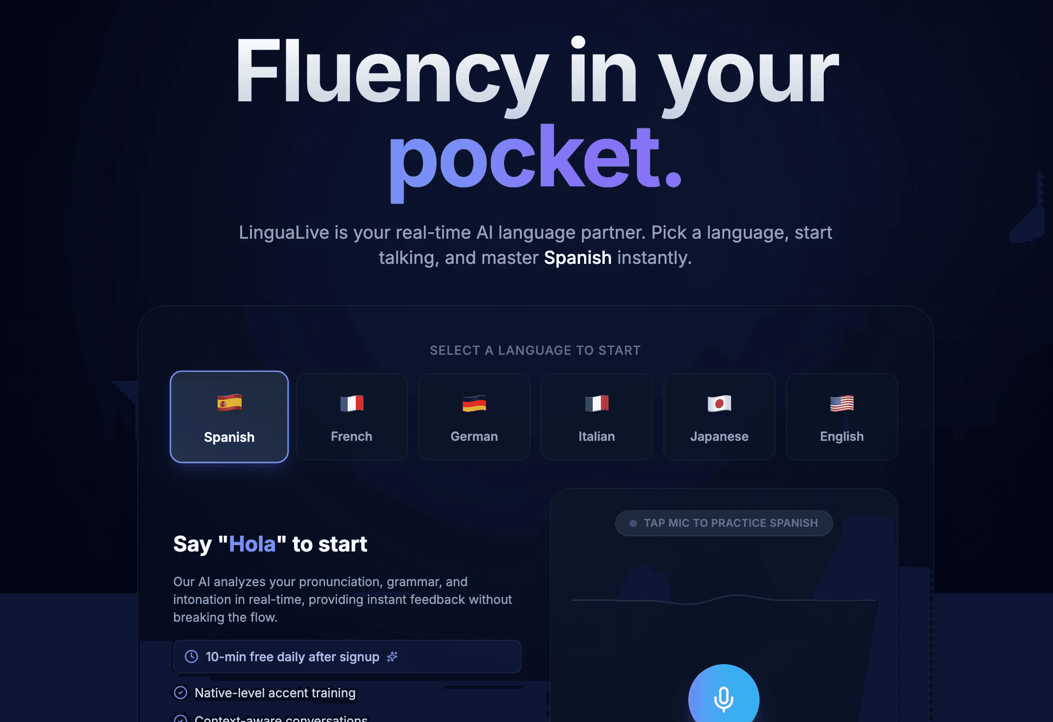 I've built an app from one good prompt for Gemini 3. This is wild, guys. LinguaLive - Your real-time AI language partner. Pick a language and start talking. It supports these languages 🇪🇸🇫🇷🇩🇪🇮🇹🇯🇵 🇺🇸